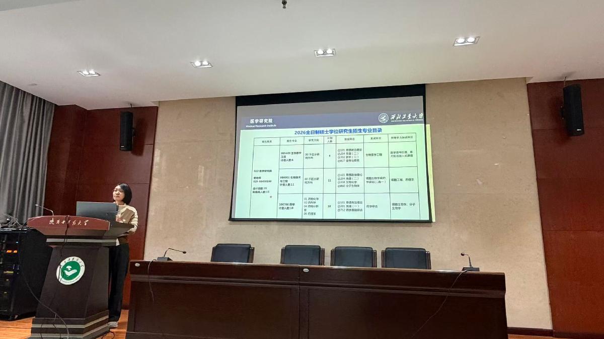 为拓展优质研究生培养资源,助力学生把握跨学科深造机遇,11月14日,西北工业大学医学研究院应邀在我校5101会议室举办2026年研究生招生专场宣讲会。本次宣讲会以“守护人类健康,共筑智慧医学”为主题,由该院段佳林、李真真、武双蝉三位教师担任主讲,我院百余名2027届本科生参会。