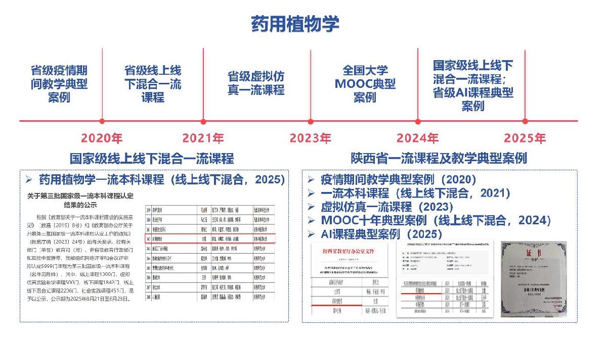 《药用植物学》作为中药类专业核心专业课程,依托中药学学科优势,历经几代人深耕建设,成效显著。先后评获陕西省疫情期间教学典型案例、陕西省线上线下混合一流课程、陕西省虚拟仿真一流课程、全国MOOC典型案例、国家级线上线下混合一流课程、陕西省AI课程典型案例。该课程既是学校药学类人才培养的重要支撑,更紧密对接中医药产业发展需求,注重形成兼具传统知识与现代技能融合的教学体系,为智慧教学改革奠定坚实基础,成为培养中医药创新人才的重要阵地。