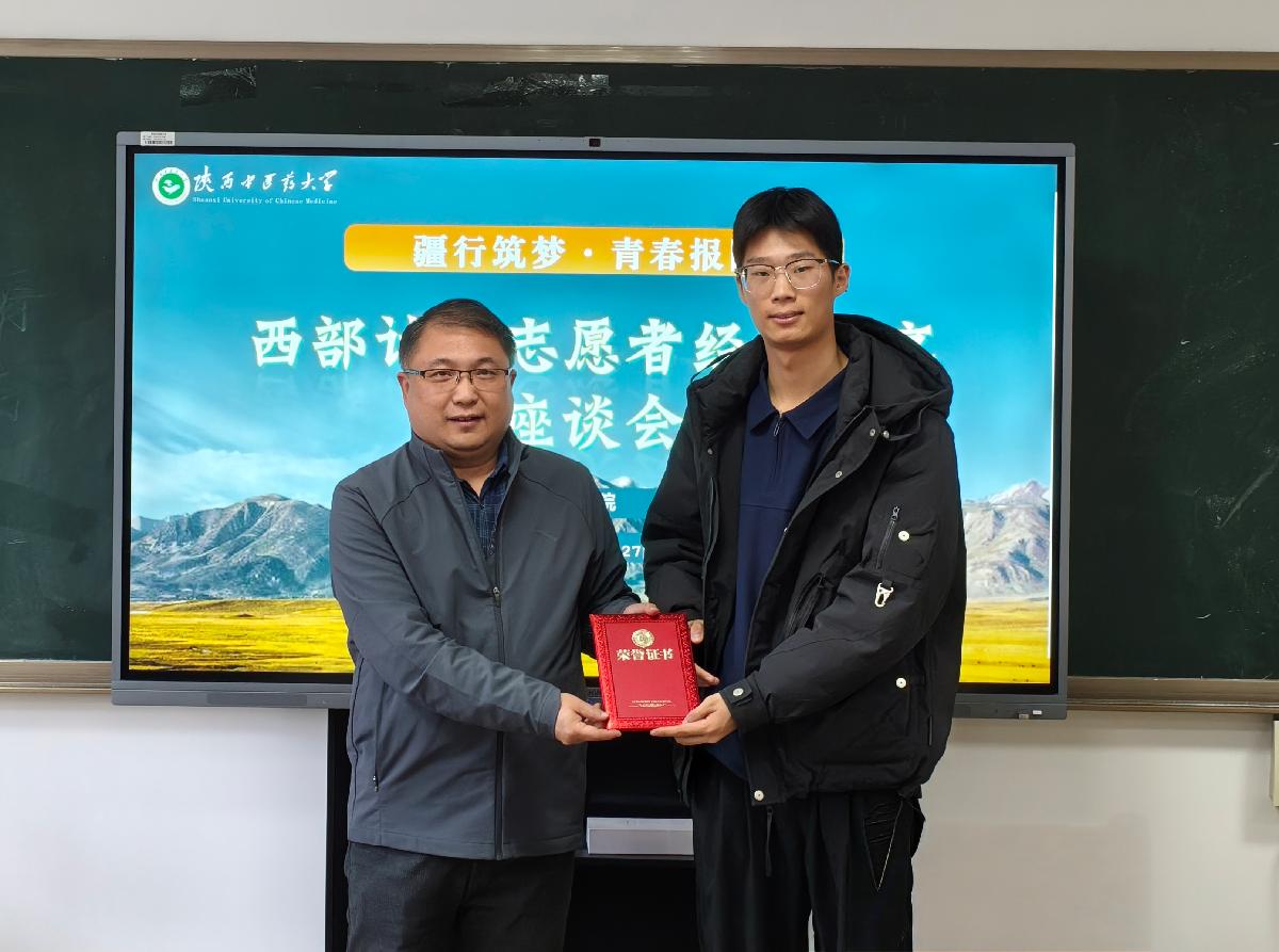 座谈会现场,学院党委副书记何屹为崔林涛同学颁发“药学院青年榜样人物”荣誉证书。这份荣誉既是对崔林涛扎根西部、甘于奉献的充分肯定,更是向全院学子发出的青春号召,激励更多青年以榜样为帆,勇赴基层、建功立业。