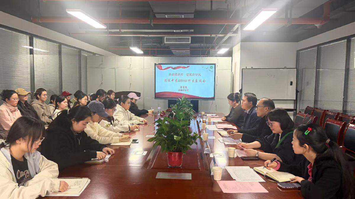 3月25日下午,药学院在科创楼15层会议室举办“承思邈薪火,建优良学风”思邈中药2501班师生座谈会。院长史亚军、副院长张岗、基础医学院教师胡灵芝、外语学院教师黄瑜、教学办公室副主任张赛及班级全体学生参会。会议由班主任李卓宁主持。