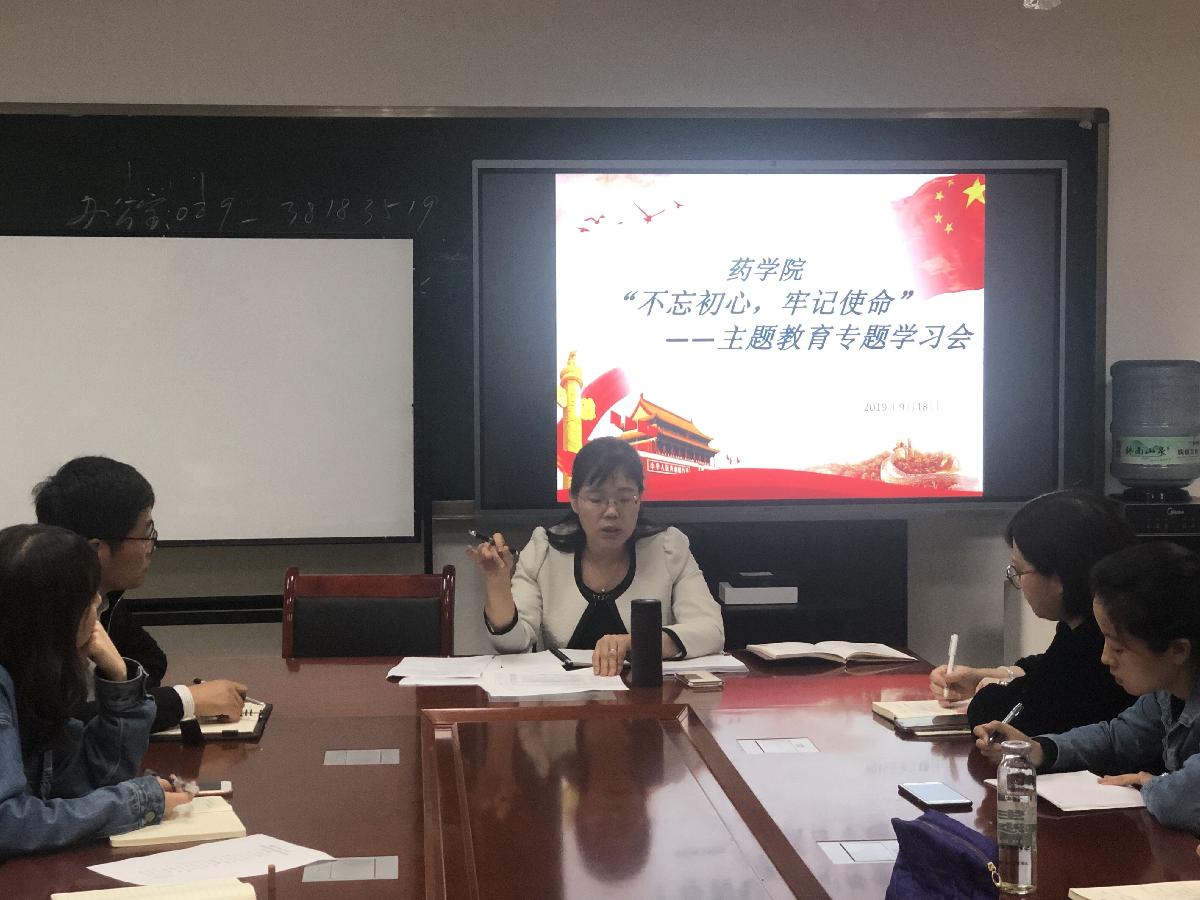 9月18日下午,药学院在四号教学楼会议室召开“不忘初心、牢记使命”主题教育专题学习会,研究部署“不忘初心,牢记使命”主题教育活动,学院党委副书记、副院长王薇、各教工支部书记、学生党支部书记参加会议。