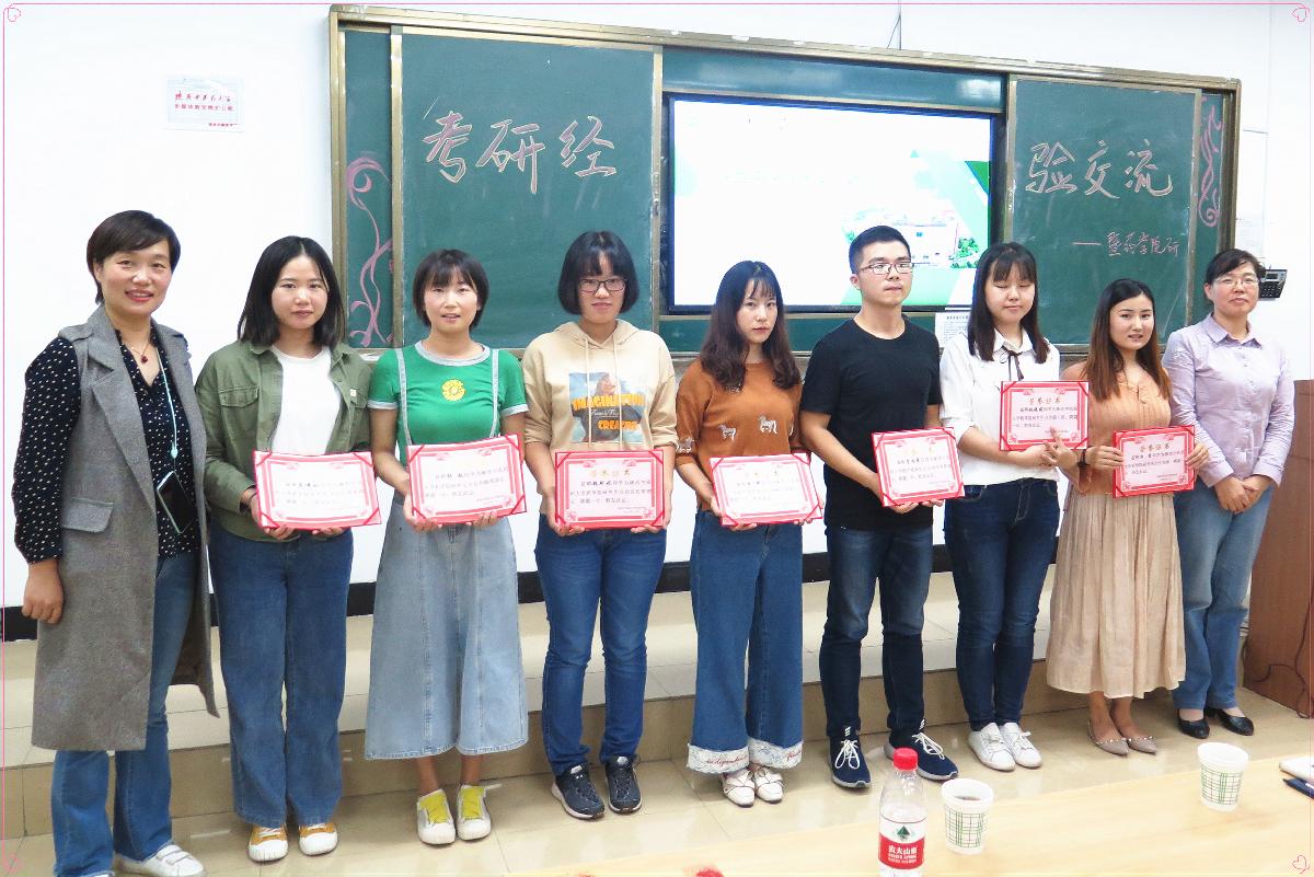 考研经验分享会由第四届研究生分会外联部部长郭敏同学主持。2019级中药学、药学班研究生李欢、薛涛涛、张玉茹、韩东、黄露、赵琦分别从考研复习方法、时间安排、考试心态、应考策略等方面进行了个人经验和体会的分享,并对参会2020级考研同学提出的疑问进行了全面细致的解答。通过分享和交流参会同学对考研环节及注意的核心和重点,为最后的复习和冲刺注入了新的动力,进一步明确了自己的目标和策略,为最终完成考研,取得优异成绩奠定了坚实的基础。最后,周莉英老师为参加分享的同学颁发荣誉证书及奖品,感谢他(她)们的认真分享,期望他(她)们在今后的学术交流中继续发挥带头模范作用,在药学院党委、研究生分会的带领下,使药学院研究生学术沙龙层次更上一层楼。